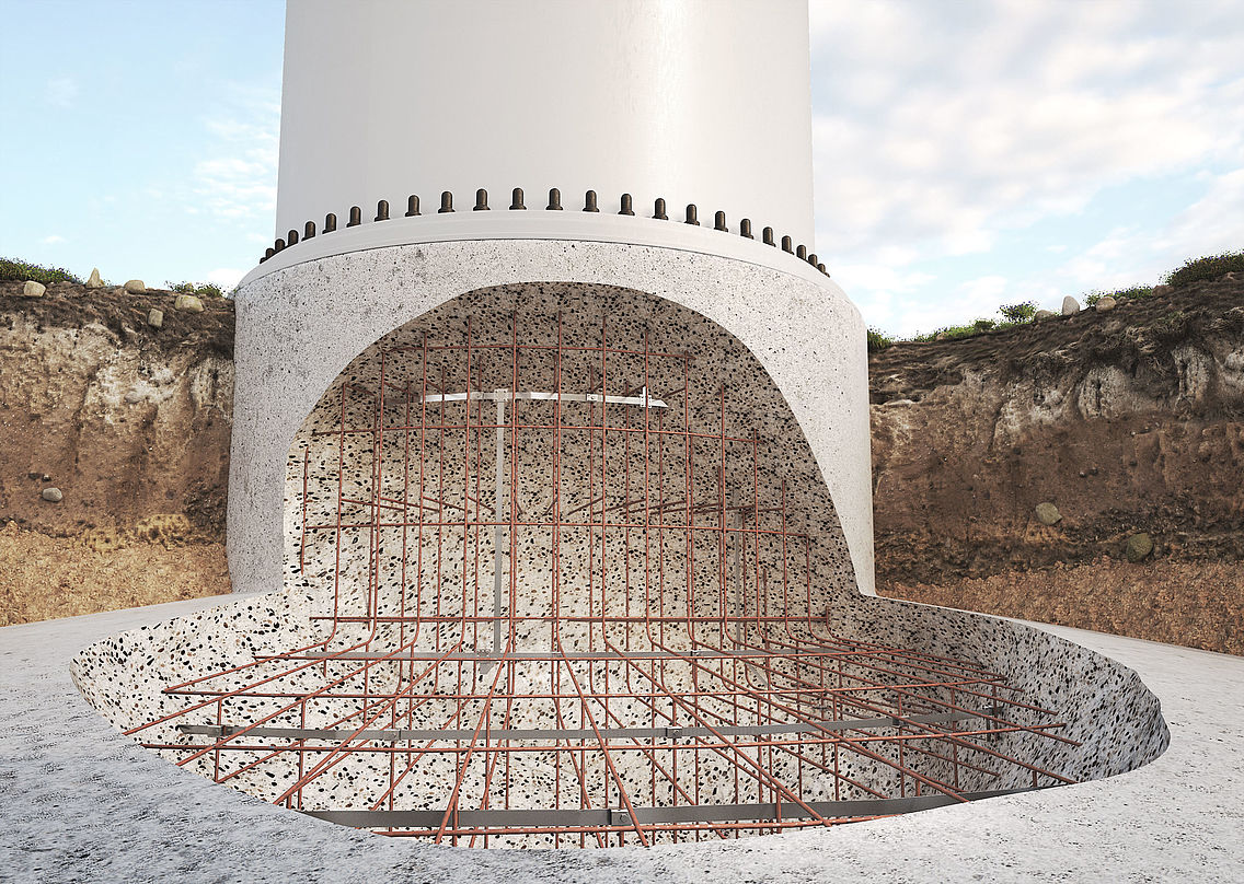 Като преходна точка между кулата и земята фундаментът на вятърната турбина изпълнява няколко задачи едновременно: от една страна той предпазва вятърната турбина от падане или потъване, а от друга отвежда в земята всички натоварвания, които възникват от ротора и собствените движения на съоръжението. Повечето сухоземни фундаменти за вятърни турбини на сушата, тоест, в зоната на сушата, са така наречените „плитко заложени фундаменти“. Те се състоят от най-вече кръгли плочи от бетон и стомана, които се вкопават в земната основа и отвеждат равномерно силите в основата. Дълбоко заложените фундаменти или пилотните фундаменти се използват при основи с недостатъчна товароносимост. При това, за да се осигури достатъчна якост, на фундаментната плоча се поставят пилоти. По този начин натоварванията се отвеждат в по-товароносимите слоеве на земната основа. Конструкцията на фундамента се определя от една страна от размерите на вятърната турбина, а от друга страна – от характеристиките на земната основа. Тя може да бъде например осмоъгълна, кръгла или кръстообразна.