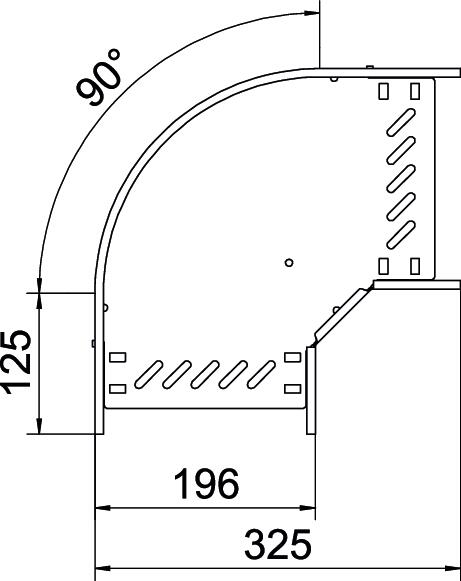 Описание на продуктаЪгъл 90° за хоризонтално отклонение, фасонен елемент за кабелни скари с височина на борда 110 mm, с бързо свързване или с болтова връзка. Безболтов монтаж посредством клемен съединител или болтова връзка с коларски болт FRS и комбинирана гайка М6. Приложима за външен и вътрешен монтаж. Свързващите елементи се поръчват отделно.
