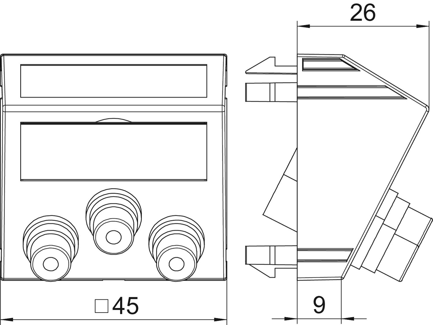 Описание на продуктаМултимедийна розетка с три чинч-букси за аудио R / L, наклонен изход, с поле за надписване, три чинч-букси (RCA) в изпълнение букса-букса, цветен код: червен/зелен/син. Директно закрепване, приложение за хоризонтален и за вертикален монтаж.