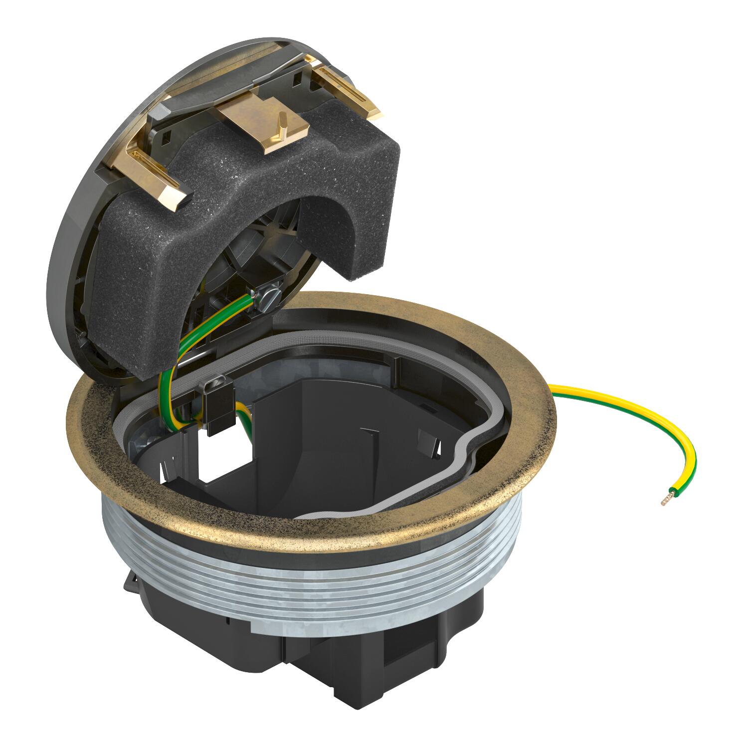 Описание на продуктаКръгла кутия за вграждане на контакти, с предпазна рамка за подовото покритие, за директен монтаж към UDL2-120, за приложение на закрито. С възможност за мокро почистване в затворено състояние. Минимална дълбочина на вграждане 70 mm.