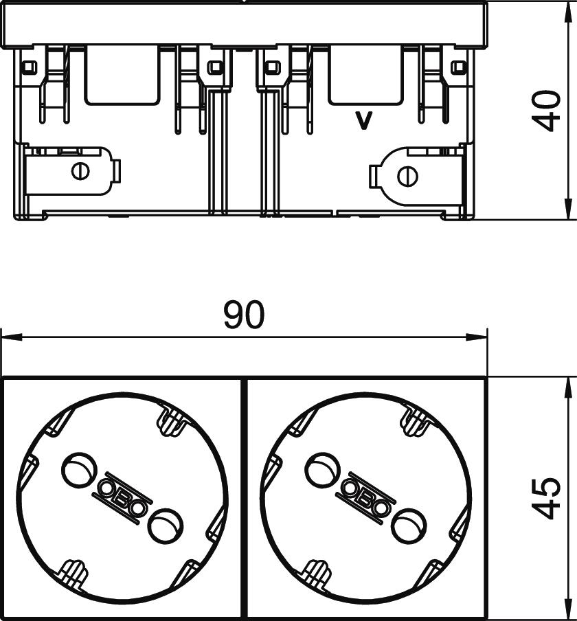 Описание на продуктаКонтактна кутия тип "Шуко" двоен 33°, с увеличена защита от интервенция, с щек- клеми, 2-полюсна, 16 A, 250 V~, със съединителни клеми по IEC 60884-1.