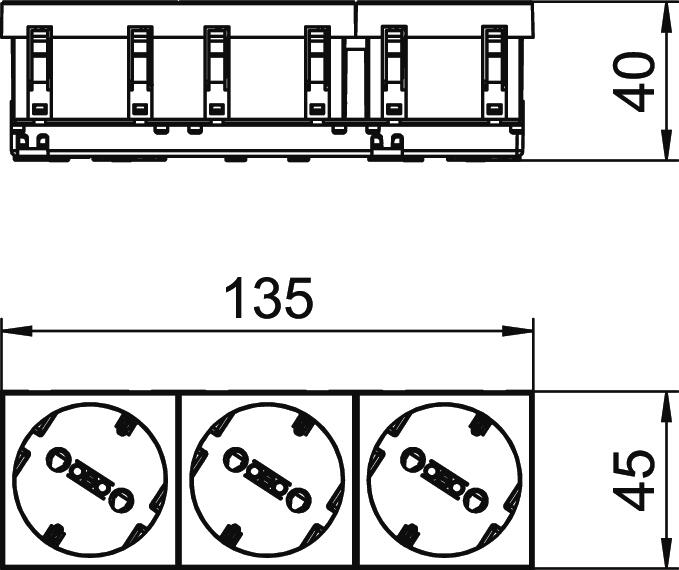 Описание на продуктаКонтактна кутия тип "Шуко" троен 33°, с увеличена защита от интервенция, с щек- клеми, 2-полюсна, 16 A, 250 V~, със съединителни клеми по IEC 60884-1.