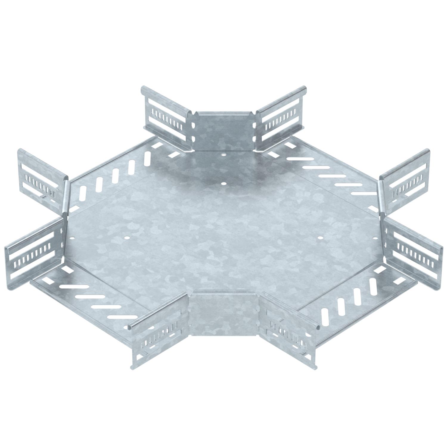 Описание на продуктаКръстовидно отклонение, хоризонтално, фасонен елемент за кабелни скари с височина на борда 60 mm, с бързо свързване или с болтова връзка. Безболтов монтаж посредством клемен съединител или болтова връзка с коларски болт FRS и комбинирана гайка М6. Приложима за външен и вътрешен монтаж. Свързващите елементи се поръчват отделно.