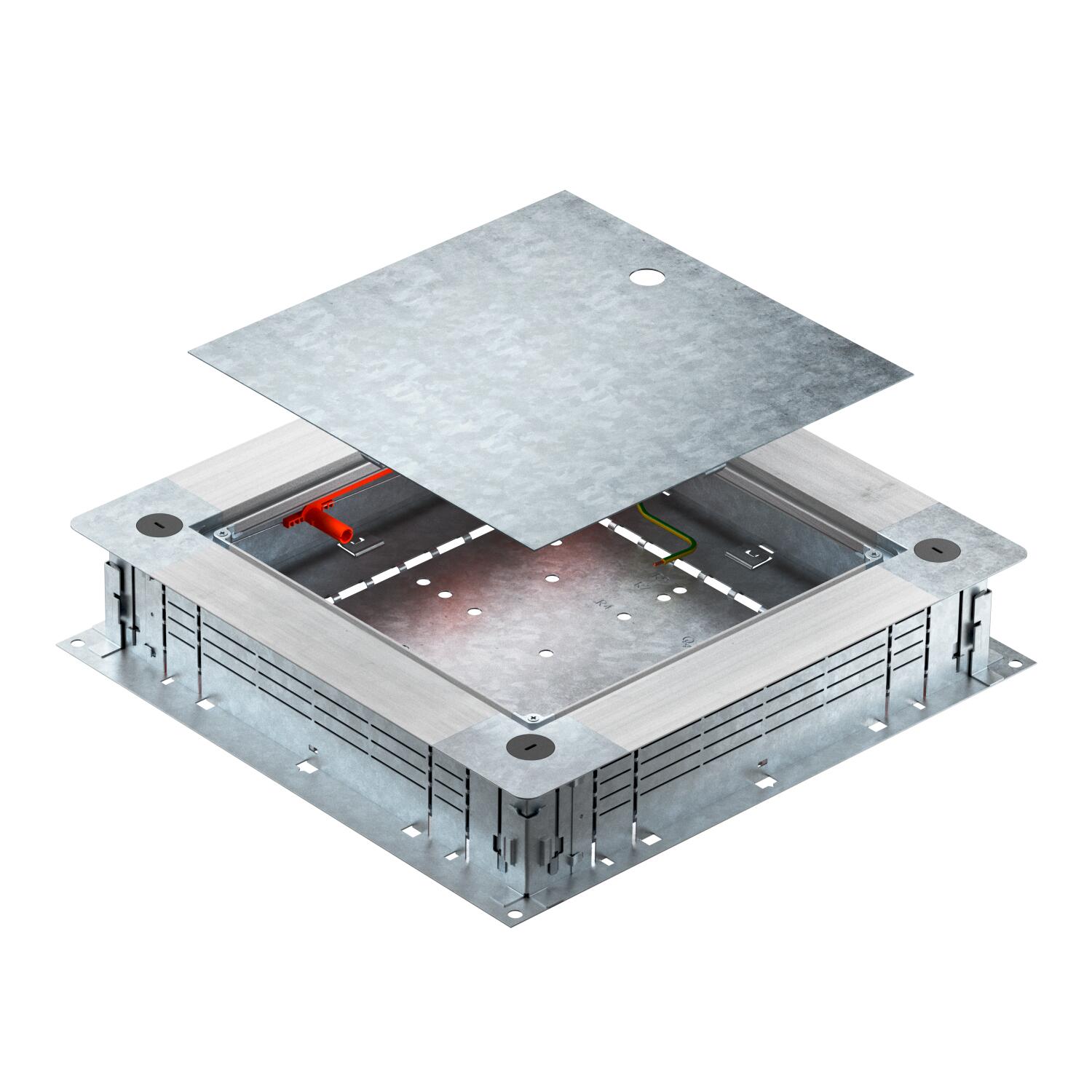 Описание на продуктаJunction and branch box for screed-covered underfloor installation duct with sheet steel side walls. For mounting of installation units in the mounting cover (to be ordered separately). Can be infinitely adjusted to a nominal screed height of 80–160 mm using the quick height-adjustment unit. The screed can be worked up to be flush with the screed draw-off edge. With noise decoupling option after screed laying and can also be used with system accessories for heavy-duty applications. Insertion of cables with the 2-part EÜK duct.