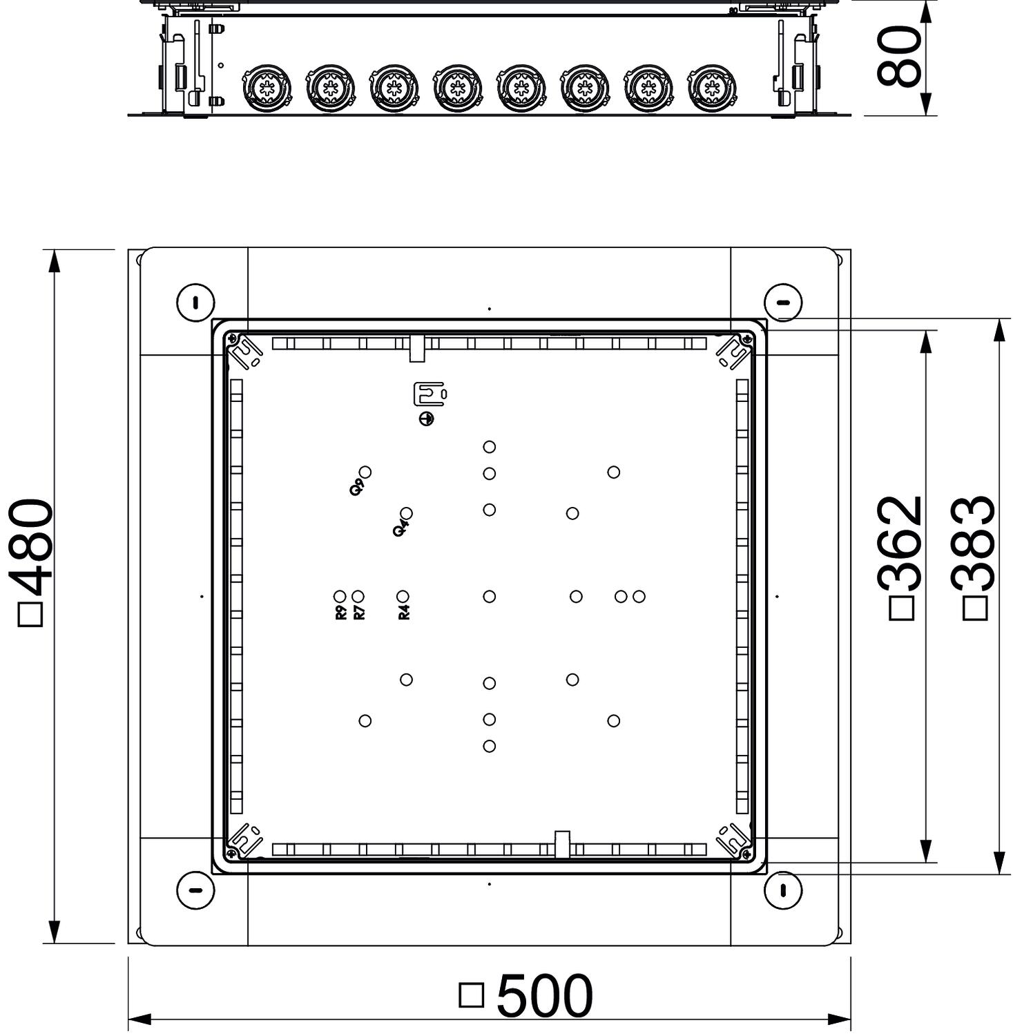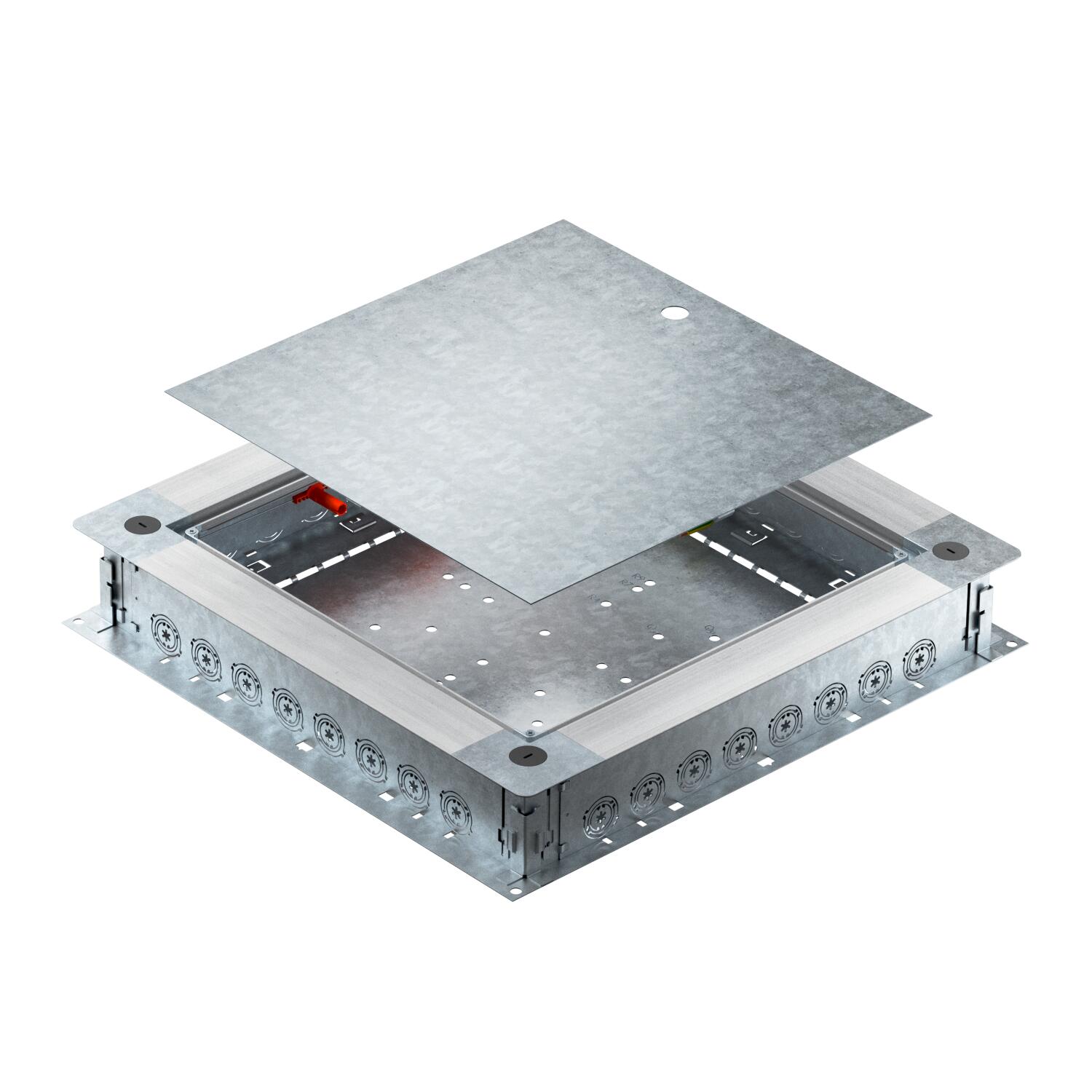 Описание на продуктаJunction and branch box UZD350-4 R with side walls made of sheet steel. For mounting of installation units in the mounting lid (to be ordered separately). Can be infinitely adjusted to a nominal screed height of 80–160 mm using the quick height-adjustment unit. The screed can be worked up to be flush with the screed edge. With an acoustic decoupling option after screed laying, and with system accessories, it can be used for heavy-duty applications. Insertion of cables through the pipe entries. Pipe entry per side suitable for 8 installation pipes each of the diameters M20, M25 and M32
