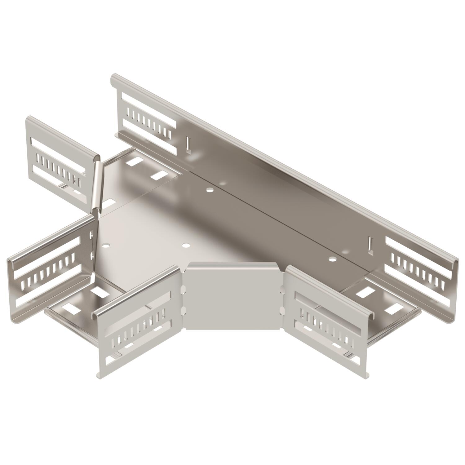 Описание на продуктаТ-отклонение, фасонен елемент за кабелни скари с височина на борда 60 mm, с бързо свързване или с болтова връзка. Безболтов монтаж посредством клемен съединител или болтова връзка с коларски болт FRS и комбинирана гайка М6. Приложима за външен и вътрешен монтаж. Свързващите елементи се поръчват отделно.