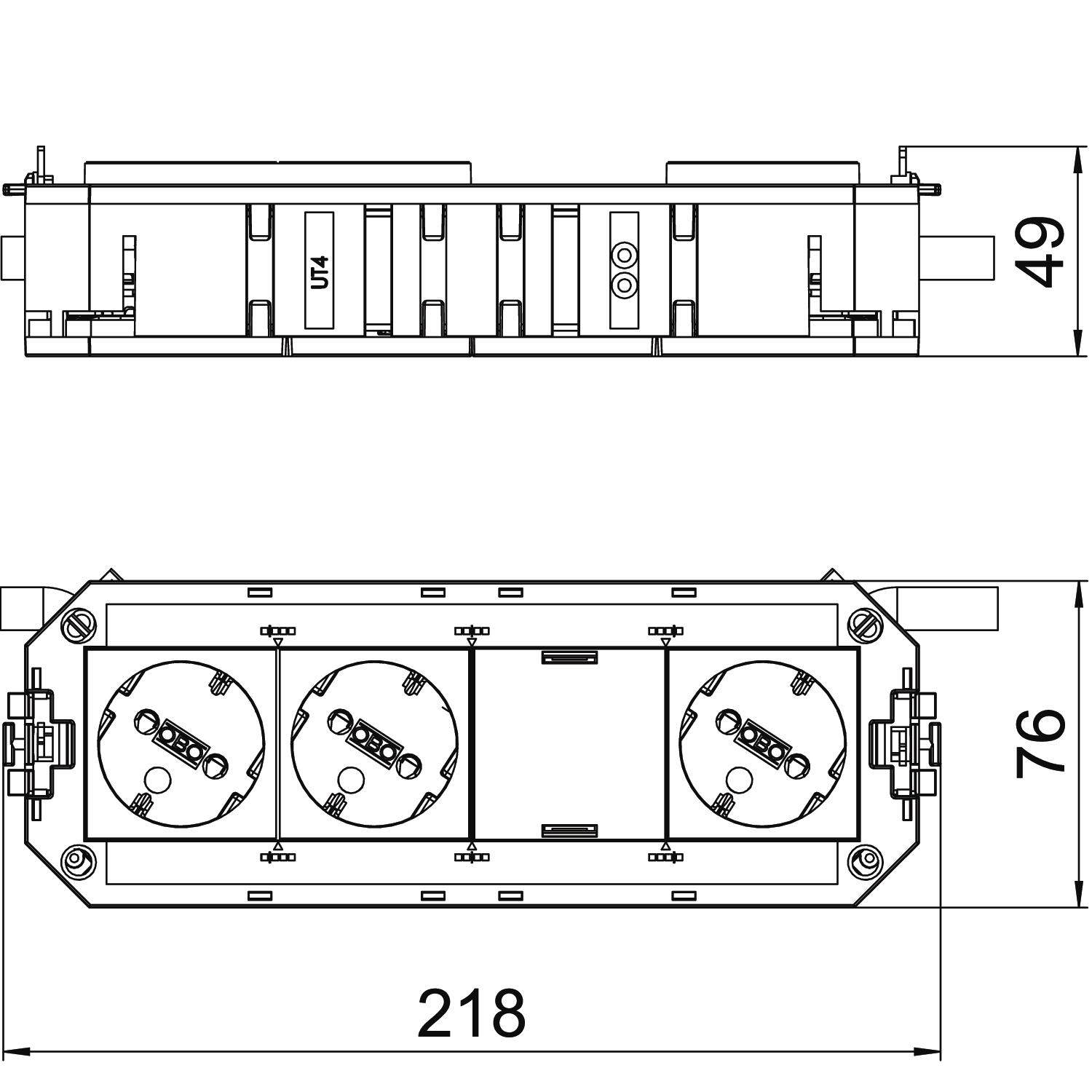 Описание на продуктаГотов за монтаж универсален носач UTC4, с 3 предварително инсталирани защитни контакта 33° - 2 бели и един зелен, 250 V~ 16 A, и една плътна монтажна рамка за допълнително вграждане на един контакт Modul45 или Modul 45connect